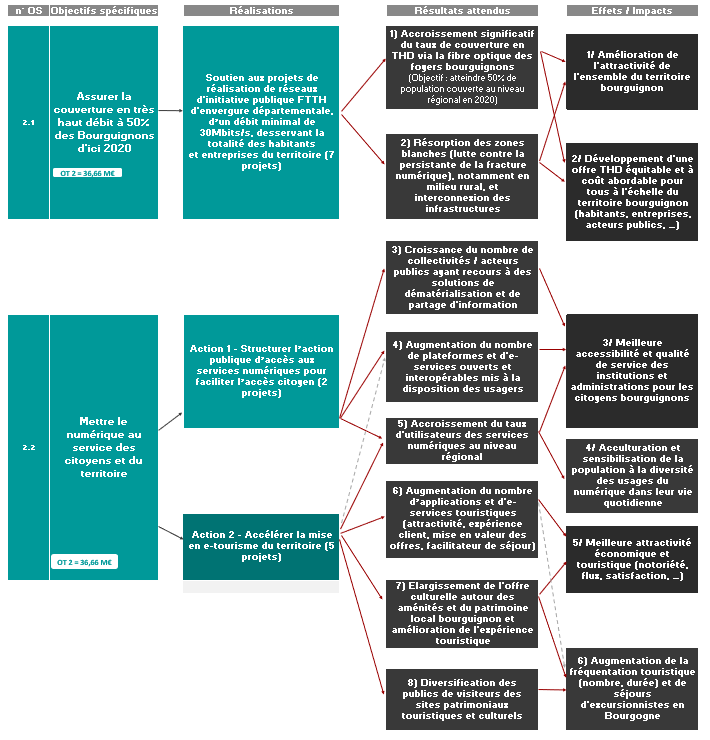 Sur la période 2014-2020, le cadre stratégique du PO FEDER-FSE Bourgogne a permis de soutenir à la fois le développement des infrastructures Très Haut Débit (Pi 2a) et le développement des usages numériques (Pi 2c) sur le territoire bourguignon. Concernant les usages, 3 domaines ont été soutenus par le FEDER : l’e-administration, l’e-formation et l’e-tourisme.